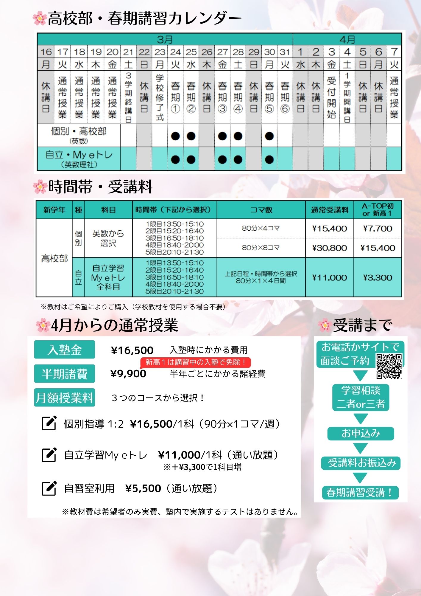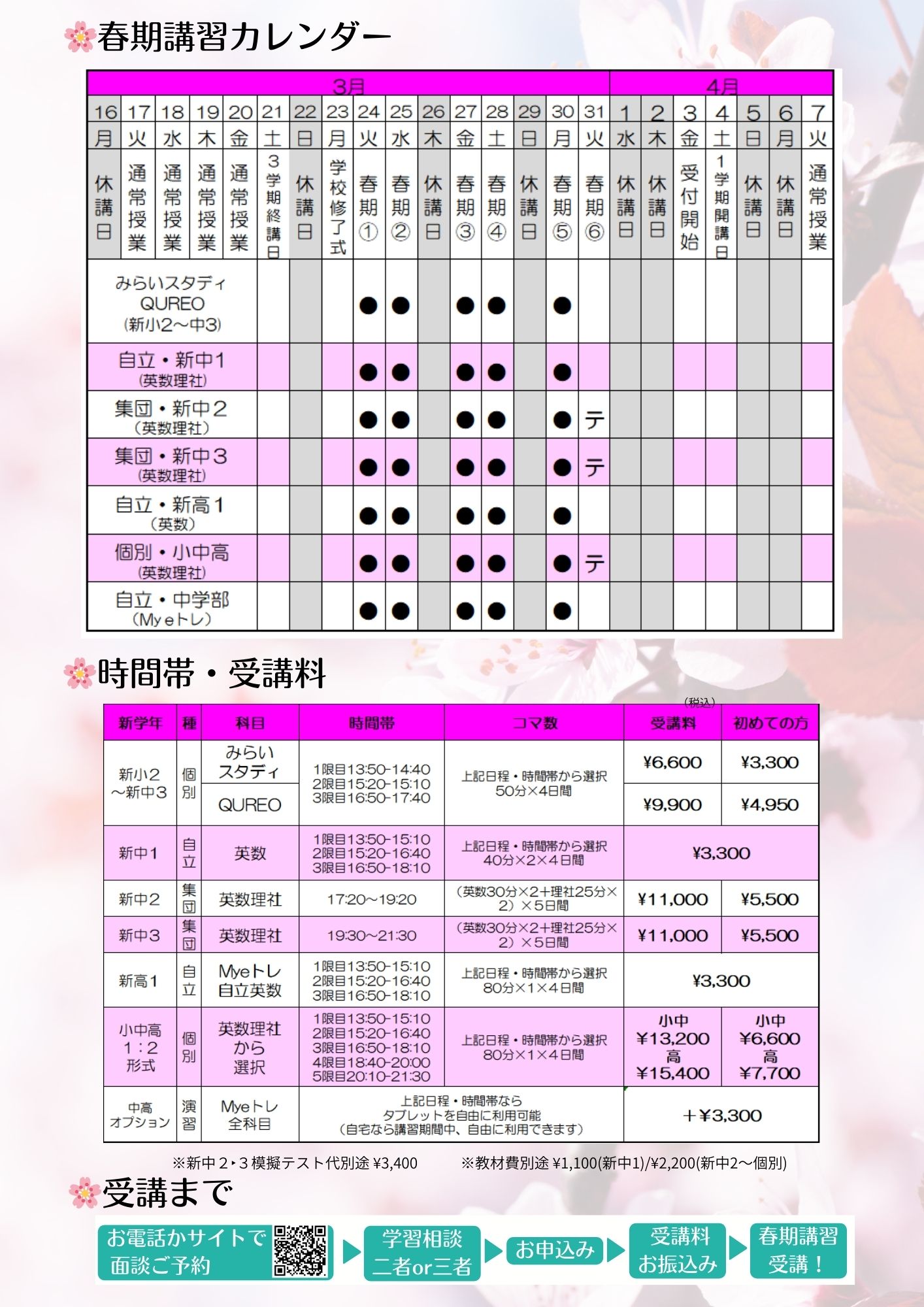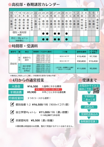 体験費用:集団指導・個別指導ともに1ヶ月授業料の半額 詳しくは以下